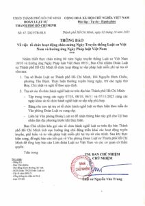 Theo Thông báo số 47/2025/TB-ĐLS ngày 02/10/2025 của Đoàn Luật sư Thành phố Hồ Chí Minh, các hoạt động hưởng ứng được tổ chức tập trung tại nhiều địa điểm trên địa bàn Thành phố, trong đó nổi bật là Chương trình Tư vấn pháp luật miễn phí diễn ra vào các ngày 07/10, 08/10, 06/11 và 07/11/2025. Đây là chương trình thường niên có ý nghĩa thiết thực, thể hiện vai trò, trách nhiệm xã hội và nghĩa vụ nghề nghiệp của giới luật sư đối với cộng đồng.