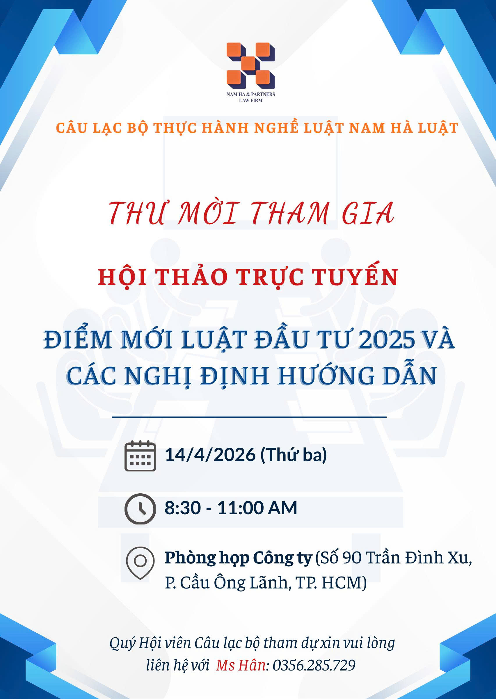 Với mô hình “Cà phê tọa đàm – Luật Nam Hà” sẽ tạo ra diễn đàn trao đổi các vấn đề mà xã hội và Doanh nghiệp đang quan tâm. Các vấn đề sẽ được phân tích, mổ xẻ bởi các chuyên gia pháp lý và chuyên gia nhiều lĩnh vực một cách linh hoạt, không chính thức mà lại là chính thức hiến kế cho doanh nghiệp nhìn nhận xử lý vấn đề. Là kênh giao lưu B2B cho doanh nghiệp giữa doanh nghiệp với các diễn giả VIP… cùng nhiều lợi ích khác.